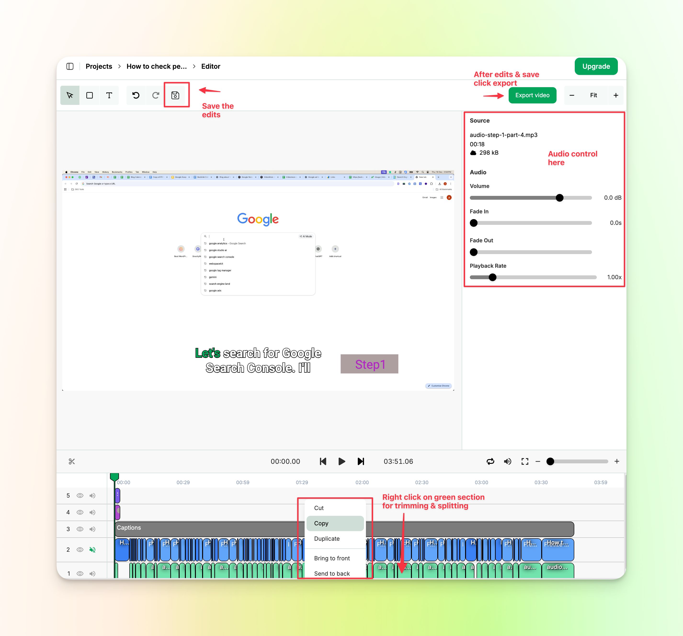 The mute & volume controls gives you full control over what audio makes it into your final video.