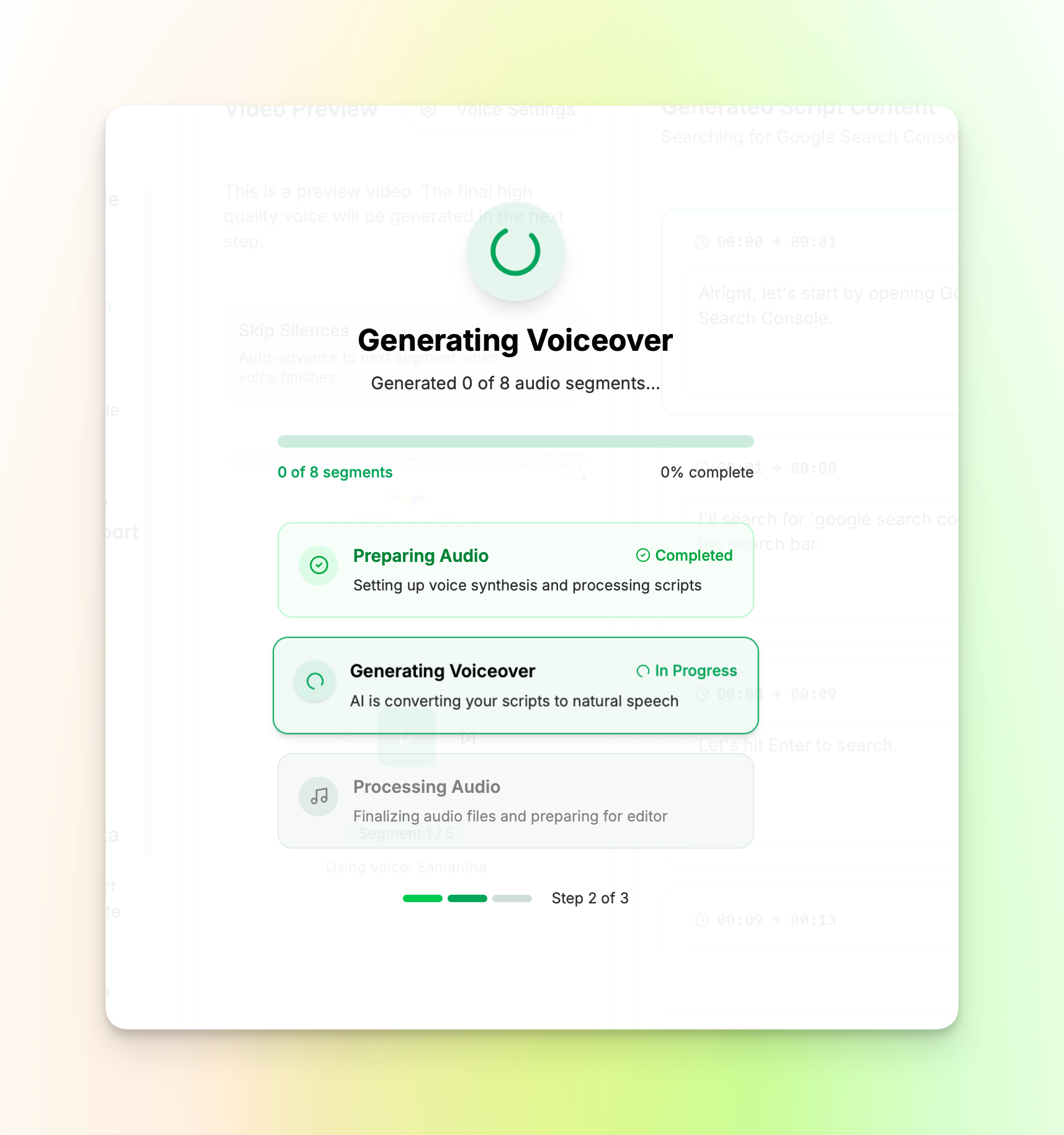 VideoMule creates audio for each segment of your script. If your video has 12 steps, it generates 12 separate audio clips.
