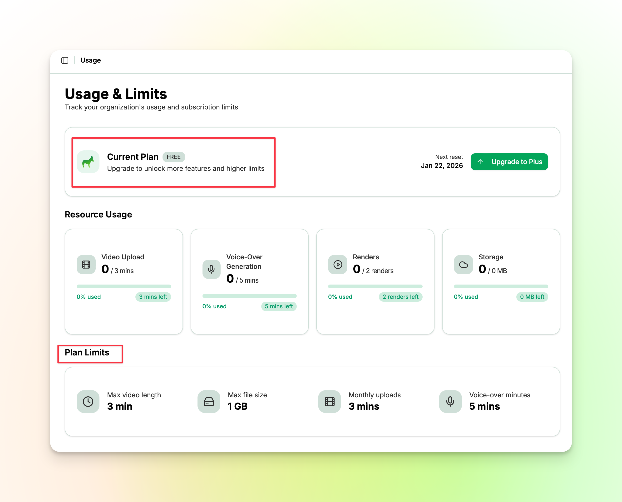 Storage: Your storage limit includes everything in your account. This means your original uploaded videos, the AI-generated voiceover files, and your final rendered videos all count toward this total. Every asset you add or create takes up a bit of this space.