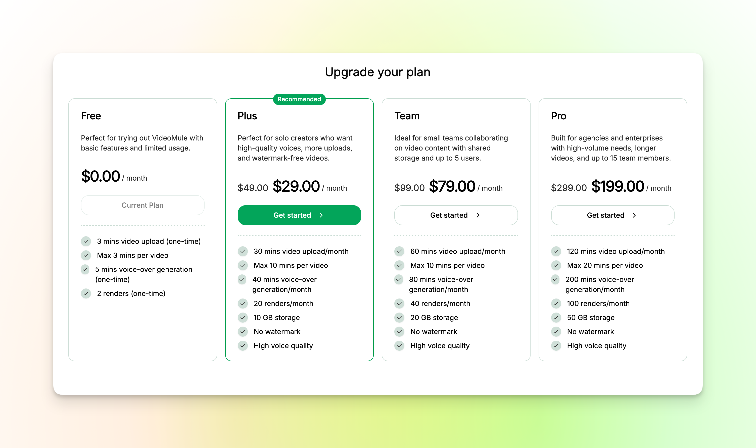 Voiceover Generation: You get 5 minutes of voiceover generation. We calculate this separately from your video uploads. This covers the audio the AI generates for your scripts.
