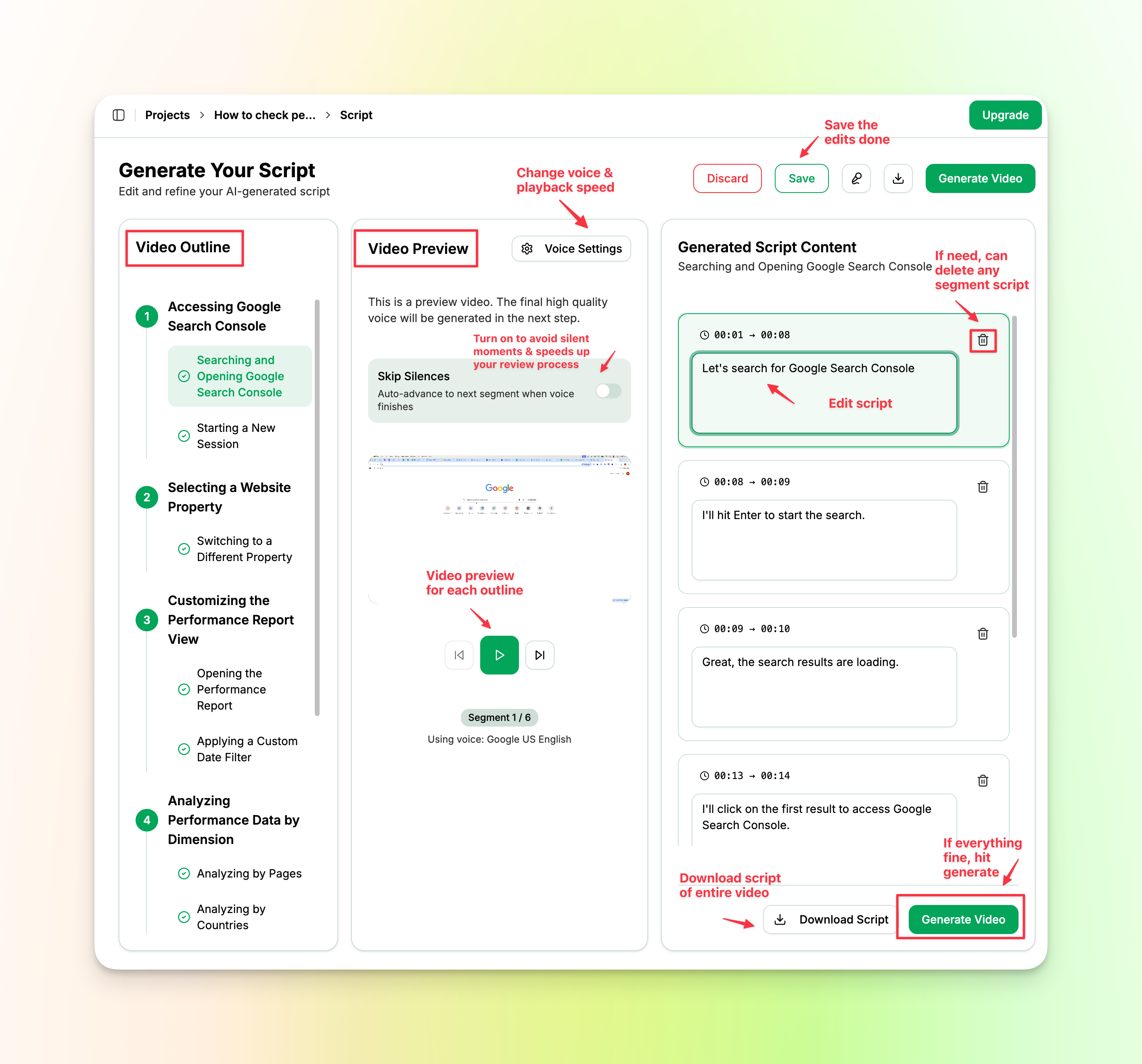This is useful when the AI-generated script doesn't quite match what you want to say, or if you need to fix a product name or add specific details.