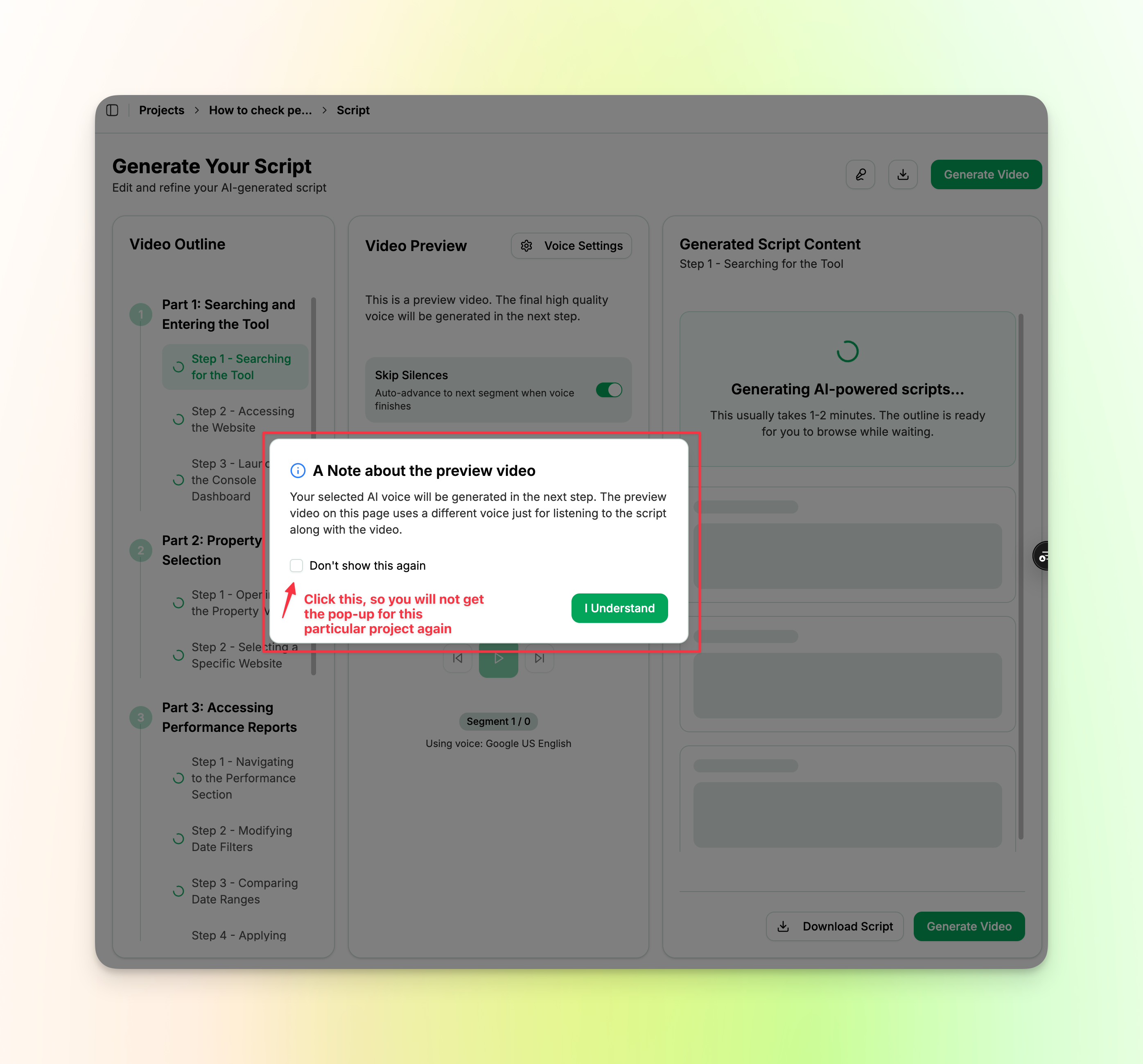 Once you’ve reviewed and confirmed your script, you can now proceed to the audio generation and automatic syncing to the video.